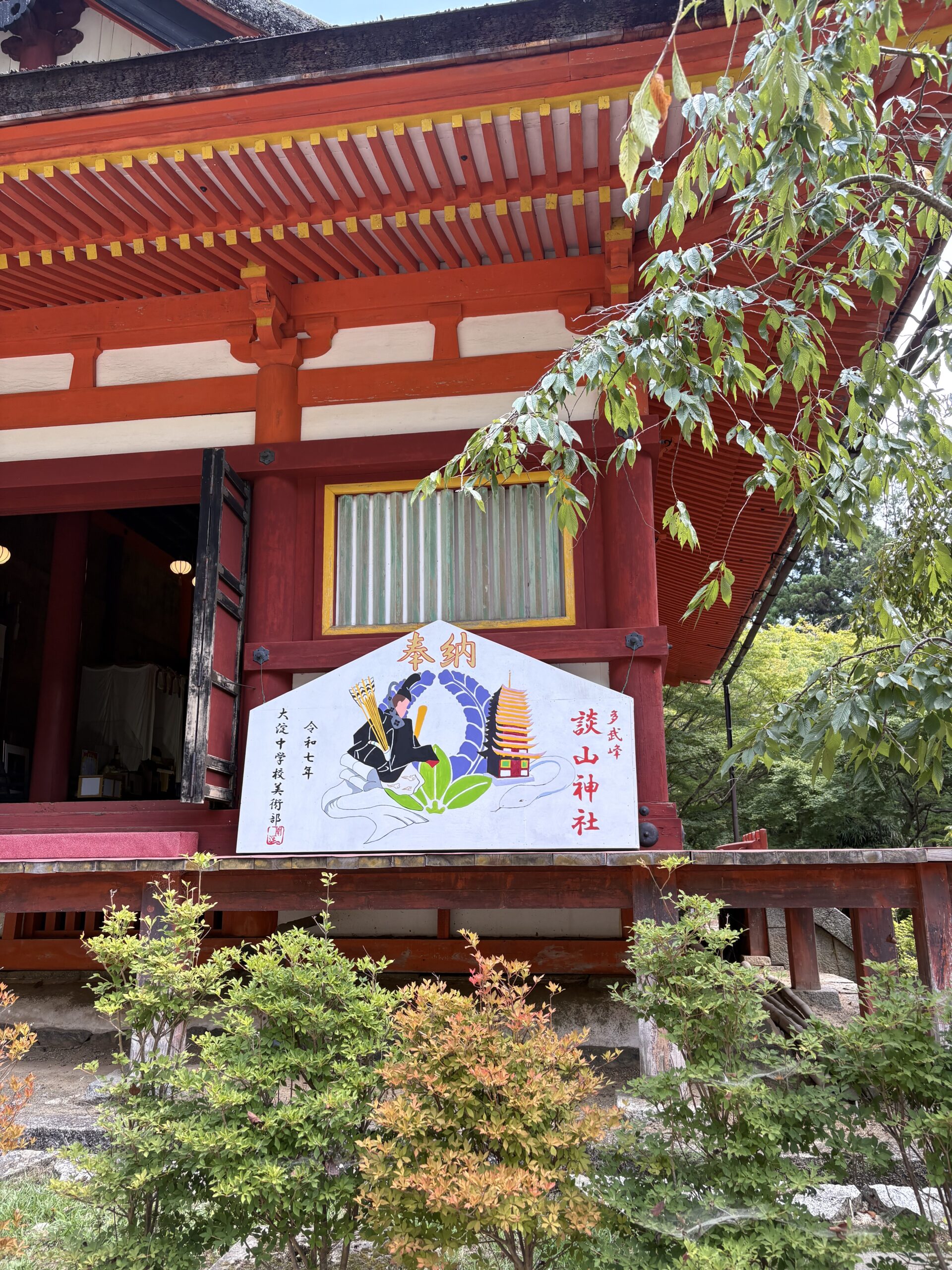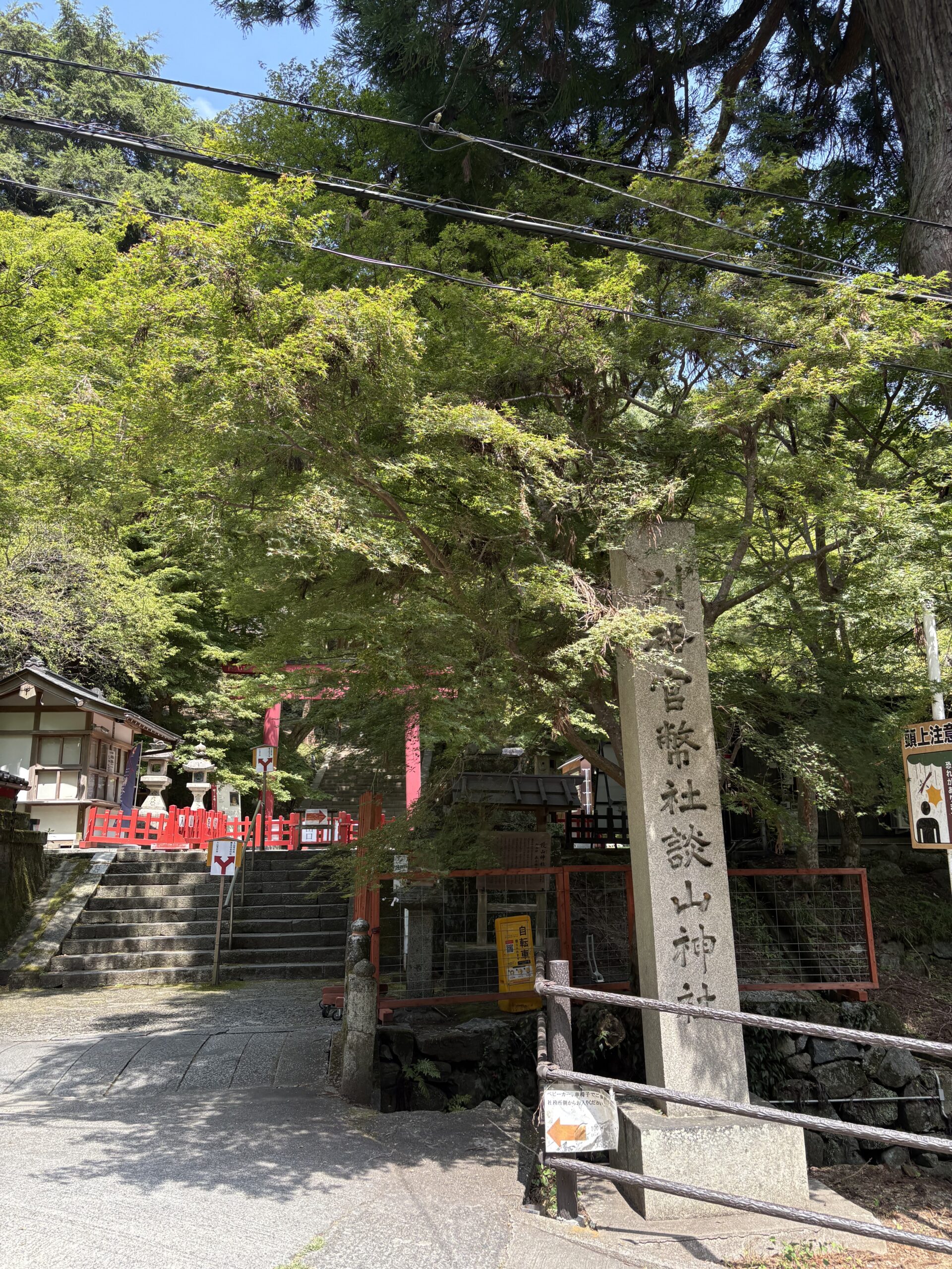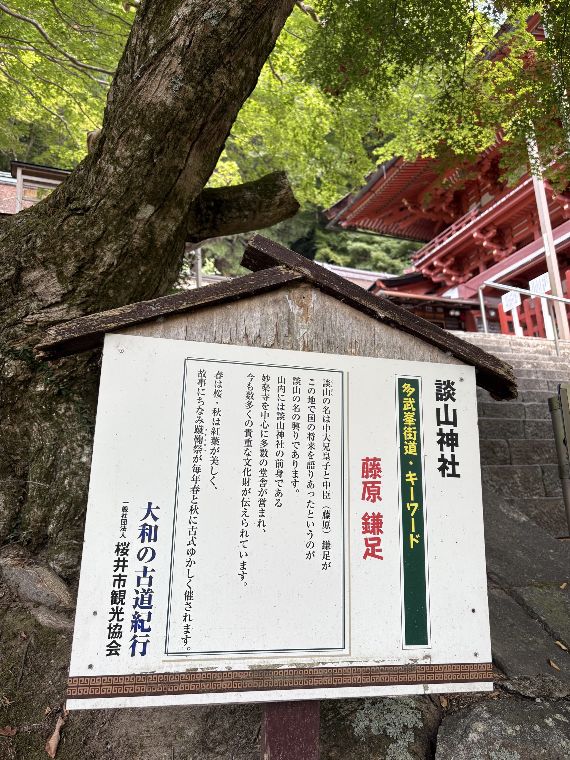 大化改新談合の地として知られ、藤原鎌足公が祀られています。中大兄皇子とこの山で国家改新の密談を交わしたことから、「談い(かたらい)山」と呼ばれ、これが社名の起こりとなっています。